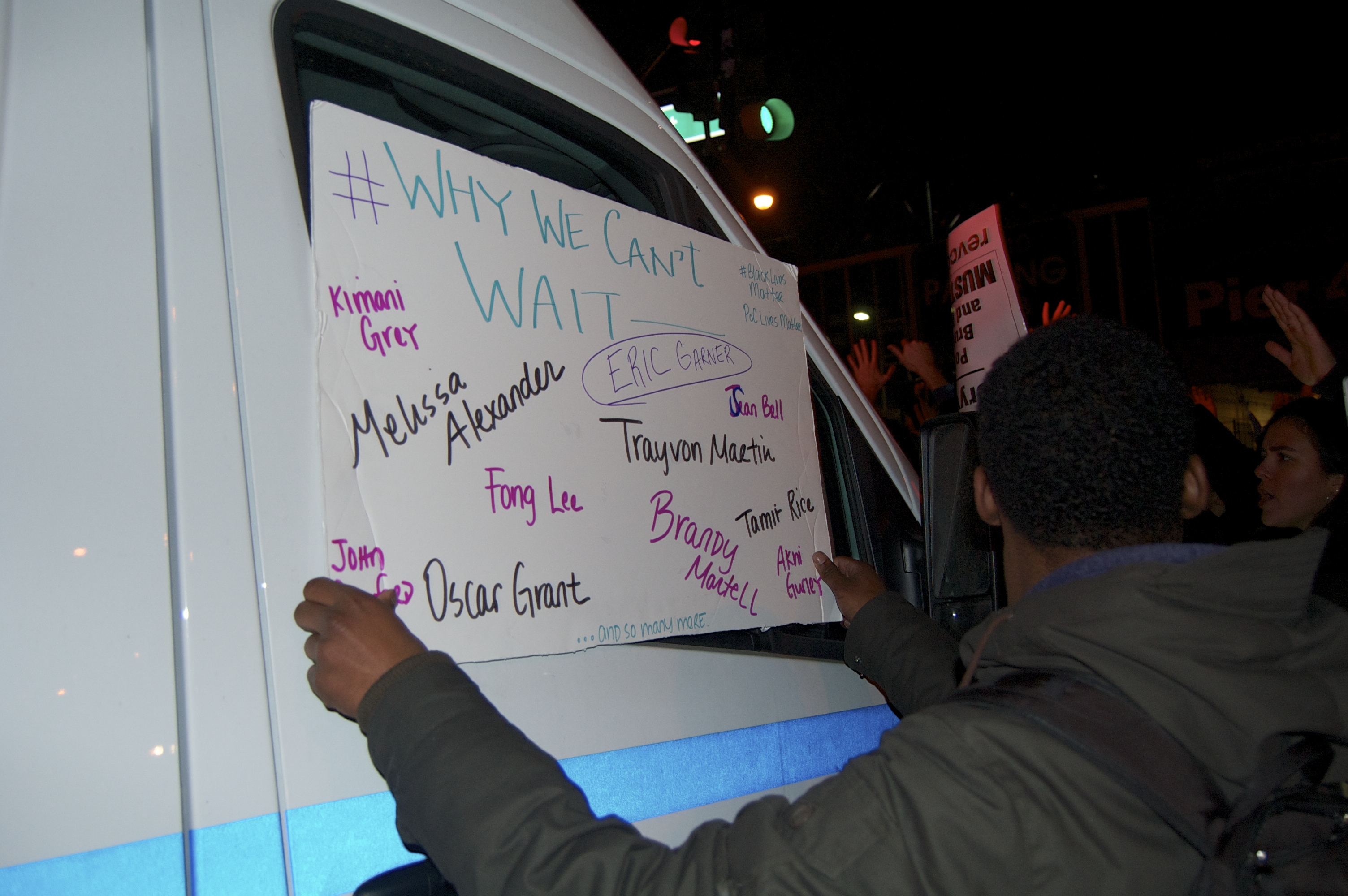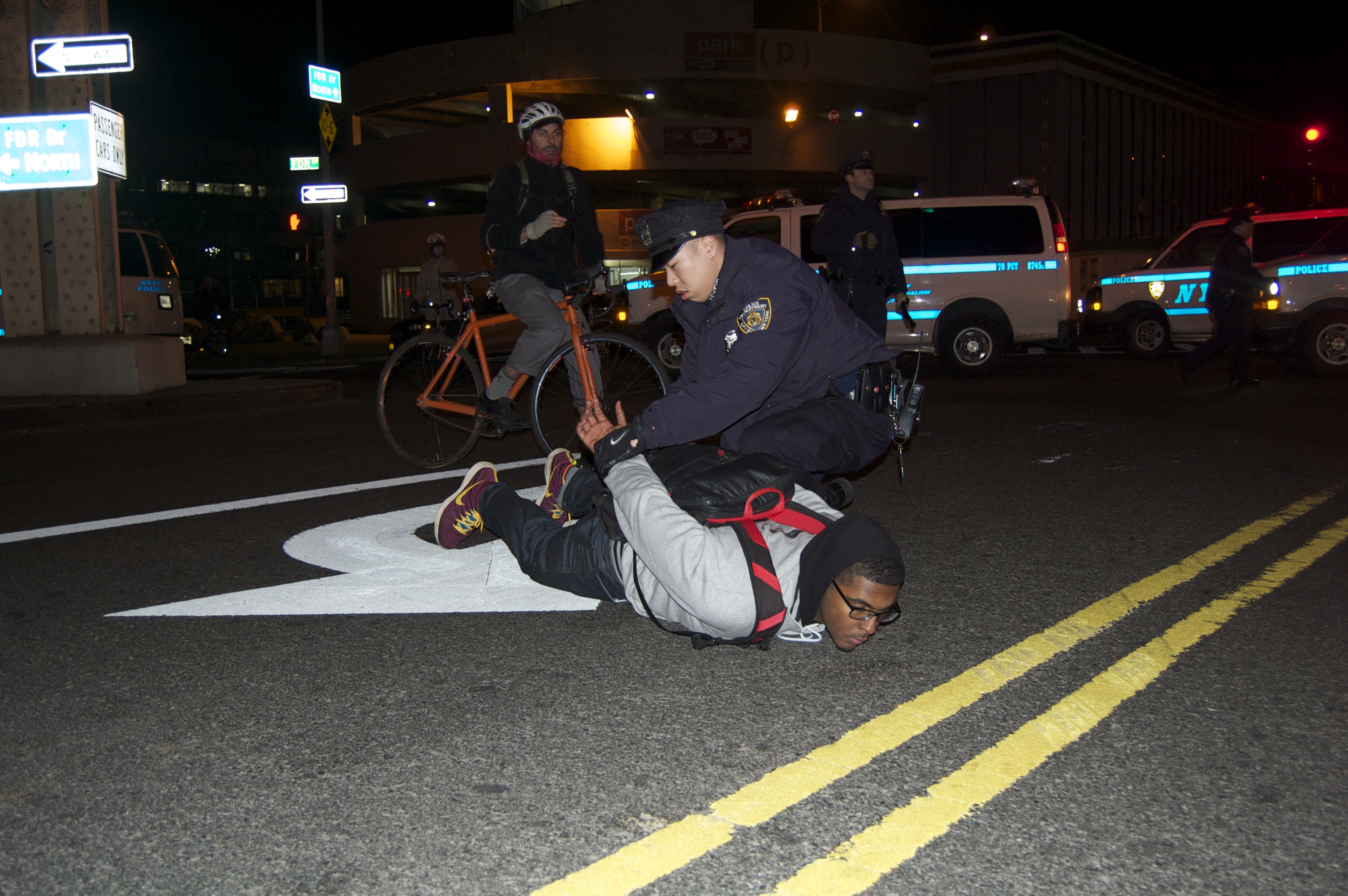 Confrontations with the police were constant. I saw several protesters arrested underneath the FDR and was almost arrested myself while taking pictures. Unlike at the 2012 marches, the NYPD were the faces that represented the very real injustice that happened three days ago. That feeling manifested itself in protesters disrupting or blocking NYPD cruisers with signs and their bodies, occasionally spitting on their hoods or tires. I did not, however, witness any destruction of property or obstruction of justice from the protesters. It began, and remained while I was there, as a peaceful march.